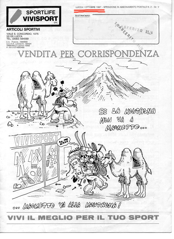 Con lo slogan “VIENI su VIVISPORT” come sotto riportato ideammo un catalogo con tanto di listino per la vendita per corrispondenza in tutta Italia. E’ utile ricordare che all’epoca non esistevano fax e e-mail. Quindi, tramite tutte le sezioni del Club Alpino Italiano, ci facemmo inviare i nominativi dei soci e spedimmo loro il nostro catalogo. Un lavoro certosino e dispendioso ma che portò i suoi frutti facendoci conoscere un po’ ovunque.